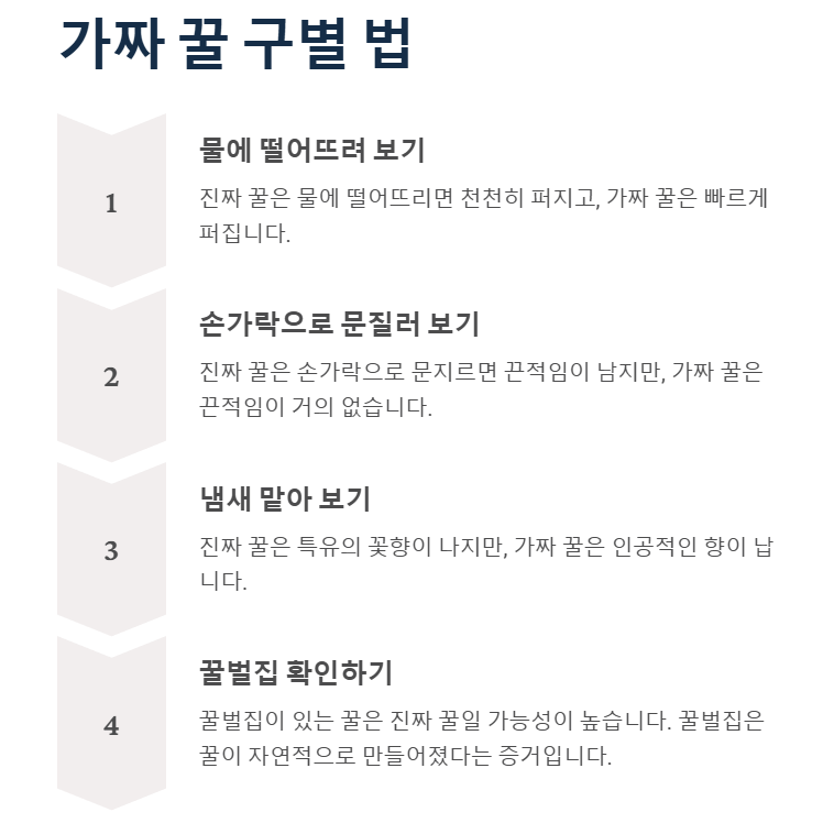 - 가짜 꿀 구별법: 진짜 꿀은 점성이 높고 천천히 흐르며, 물에 넣었을 때 바로 섞이지 않고 가라앉아요. 가짜 꿀은 빠르게 섞이는 특징이 있어요.