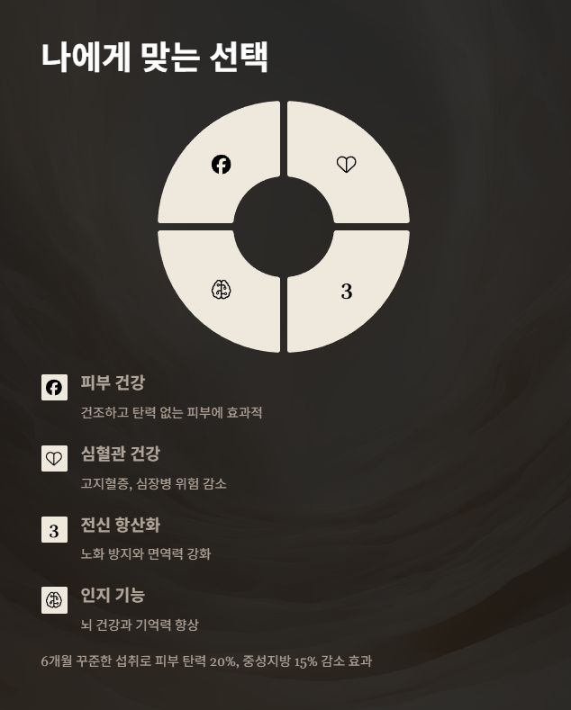 - 심혈관 건강: 고지혈증이나 심장병 위험이 있다면 오메가3가 중성지방을 낮추고, 비타민 E가 혈관을 보호해요.