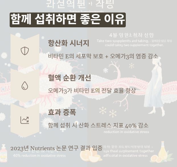 2023년 Nutrients 논문에 따르면, 비타민 E와 오메가3를 12주간 함께 섭취한 그룹에서 산화 스트레스 지표가 40% 감소한 결과가 나왔습니다.