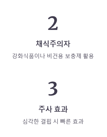 A3. 심각한 결핍이 있는 경우 주사가 더 빠르게 효과를 볼 수 있지만, 일반적으로는 경구 섭취로도 충분합니다.