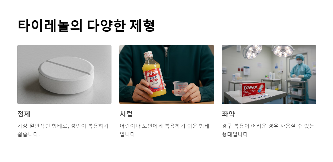 - 다양한 제형: 타이레놀은 정제, 시럽, 좌약 등 다양한 제형으로 제공되어, 개인의 필요에 따라 선택할 수 있습니다. 특히 어린이나 노인에게는 복용하기 쉬운 시럽 형태가 유용합니다.