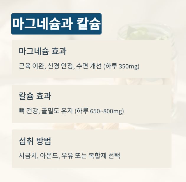 마그네슘은 근육 이완과 신경 안정에, 칼슘은 뼈 건강에 필수입니다.