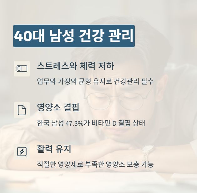 40대 남성 영양제 가이드! 비타민 D, 오메가-3, 마그네슘 등 필수 영양소와 섭취법을 정리했습니다. 건강한 40대를 위한 정보를 지금 확인하세요!